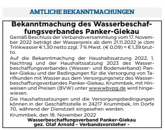 Der Wasserbeschaffungsverband Panker-Giekau beabsichtigt im Rahmen von Wartungs-arbeiten Versorgungsleitungen in